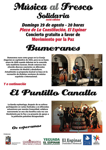 La organización de Musica al fresco ha programado en El Espinar un concierto solidario que dará apoyo a la población palestina discapacitada, iniciativa con la que pretenden facilitar la vida de aquellos discapacitados que viven bajo el conflicto de su tierra. De ellos, de sus familiares y los profesionales sanitarios que se desviven por facilitar la inclusión de estas personas en su comunidad. El proyecto que está respaldado por la ONG Movimiento por la Paz, se llevará a cabo el domingo 29 de agosto a las 20:00 horas en la Plaza de la Constitución de El Espinar.