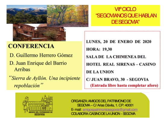 «Sierra de Ayllón. Una incipiente repoblación» es una conferencia organizada por la asociación de Amigos del Patrimonio de Segovia, dentro del VII Ciclo de Segovianos que hablan de Segovia.