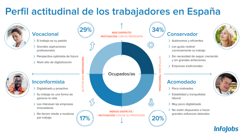 En este marco sociolaboral, InfoJobs -la plataforma de empleo líder en España- ha presentado el análisis de Los perfiles actitudinales de los trabajadores en España. El estudio pretende dar a conocer los diferentes rasgos de personalidad de los perfiles que componen el actual mercado de trabajo, atendiendo principalmente a dos ejes: el nivel motivacional laboral presente por parte del profesional y la perspectiva del mundo laboral que tiene. A partir de dichos ejes, InfoJobs define cuatro perfiles de empleados distintos: el vocacional, el conservador, el acomodado o el inconformista.