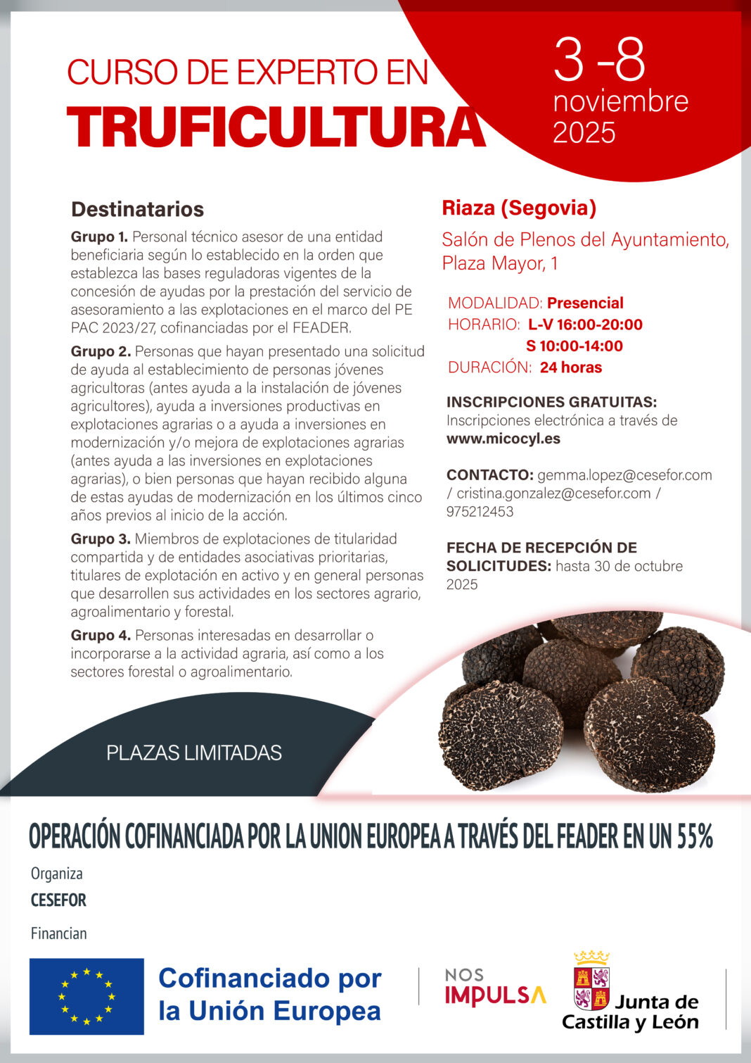 El Curso de Experto en Truficultura se celebrará del 3 al 8 de noviembre en Riaza. Persigue ofrecer «una formación completa y especializada», abarcando desde los fundamentos del cultivo de trufas hasta aspectos técnicos más avanzados del sector. Los participantes tendrán acceso a un programa que combina teoría y práctica, proporcionando las herramientas necesarias «para iniciar y gestionar plantaciones truferas con éxito».