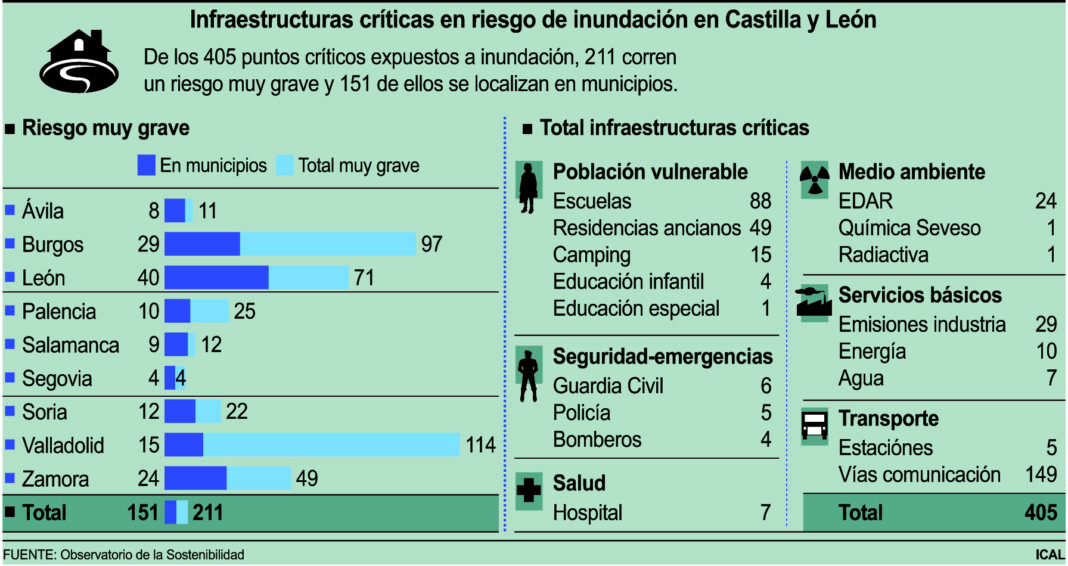En el conjunto de Castilla y León, el informe identifica 405 puntos, instalaciones o infraestructuras críticas localizadas dentro de la lámina de inundación de 500 años, de las que 211 presentan un riesgo muy grave de sufrir inundaciones. Estas se reparten en 151 municipios y afectan a servicios esenciales, infraestructuras estratégicas y equipamientos sensibles.