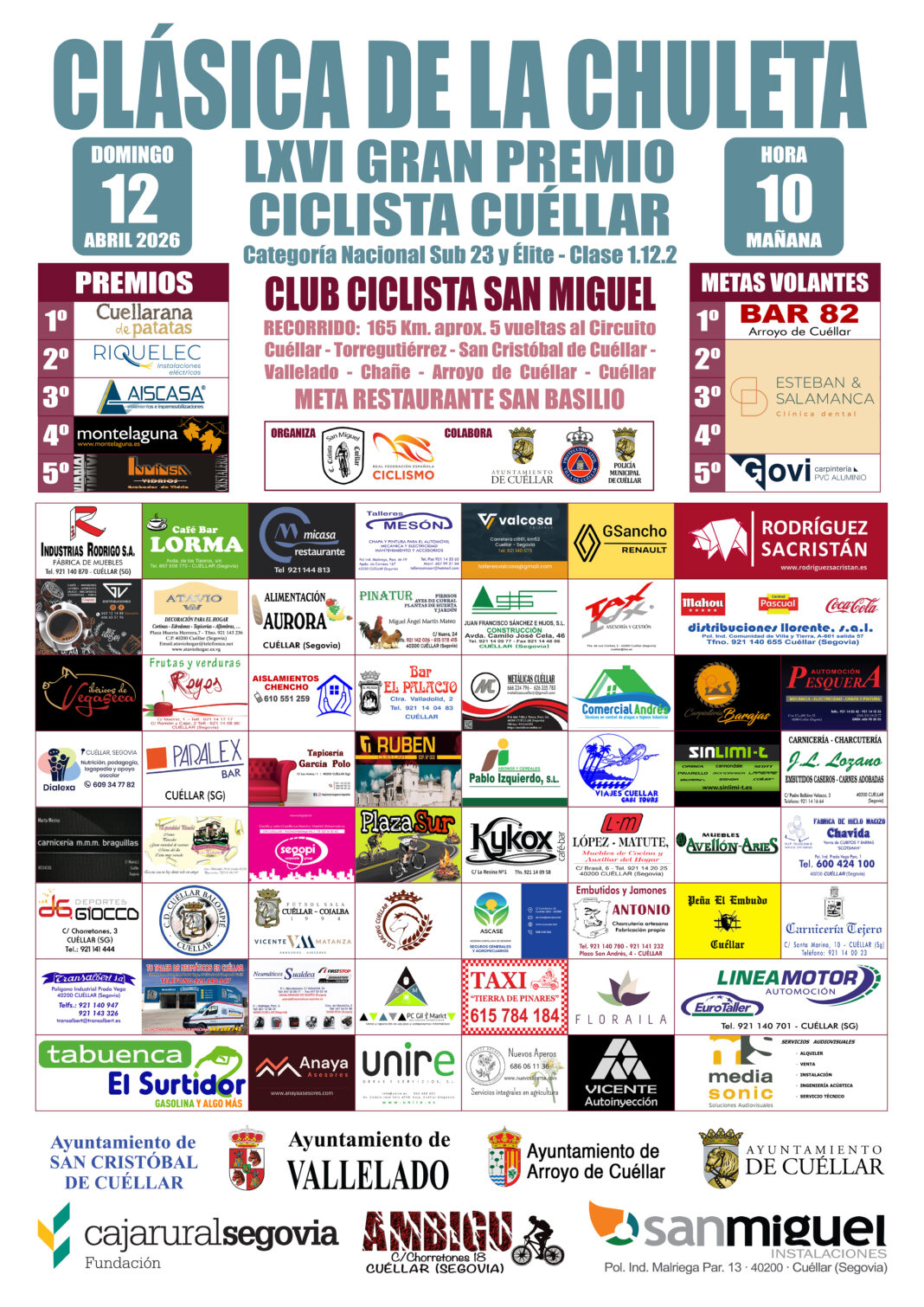 Cuéllar vivirá este fin de semana una de sus citas más emblemáticas con la celebración de la LXVI edición del Gran Premio Ciclista de Cuéllar – Clásica de la Chuleta, que tendrá lugar este domingo, 12 de abril, a partir de las 10:00 horas. La prueba, profundamente arraigada en la localidad, volverá a combinar deporte, tradición y ambiente festivo.