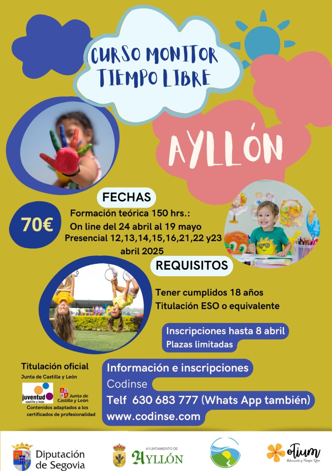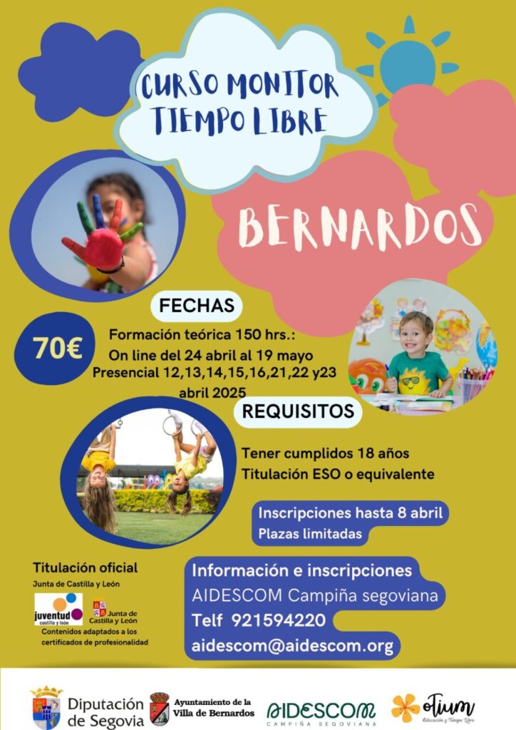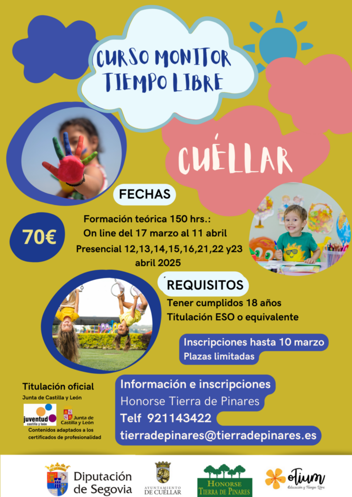 La Diputación de Segovia facilita realizar el curso de Monitor de Ocio y Tiempo Libre a jóvenes de entre 18 y 20 años en cuatro pueblos de Segovia. El curso se impartirá entre el 17 de marzo y el 23 de abril en Cantimpalos y Cuéllar, mientras que en Ayllón y Bernardos se desarrollarán entre el 12 de abril y el 19 de mayo.