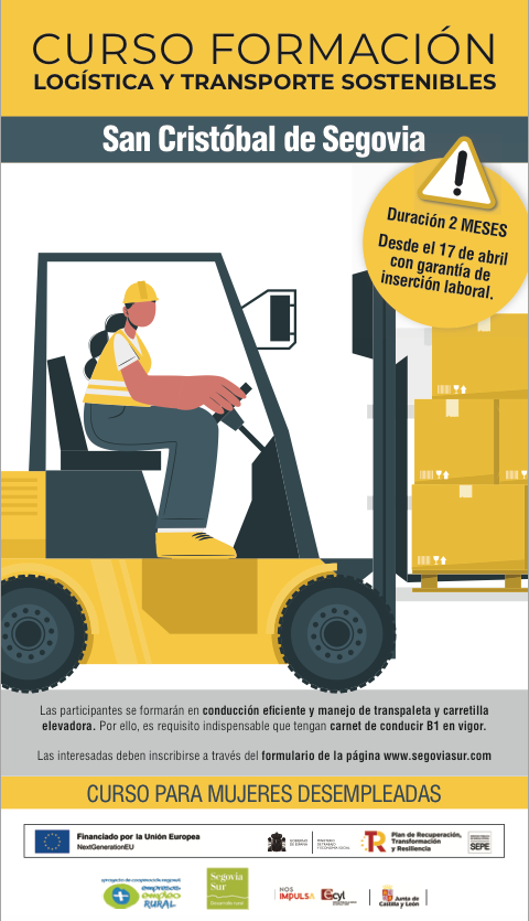 Este itinerario formativo se desarrollará en la localidad de San Cristóbal de Segovia. Las participantes se formarán en conducción eficiente y manejo de transpaleta y carretilla elevadora con practicas y certificado. Por ello, es requisito indispensable que tengan carnet de conducir B1 en vigor.