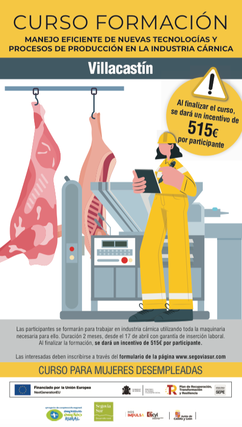 Este itinerario formativo tendrá lugar en Villacastín. En este caso, las participantes se formarán para trabajar en industria cárnica utilizando toda la maquinaria necesaria para ello. La formación se realizará en las instalaciones de Hola Food donde podrán adquirir las destrezas necesaria para trabajar en el sector. Las que finalicen la formación recibirán, además, un incentivo económico de 515 euros.