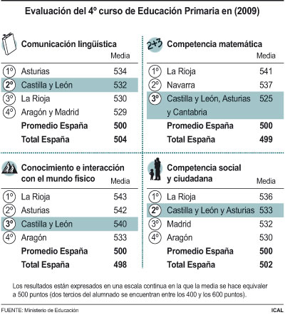 Castilla y León se ha situado en tercer lugar entre las 17 comunidades autónomas con mejores resultados en la evaluación general diagnóstica, elaborada por el Ministerio de Educación a los alumnos de cuarto de Primaria (9-10 años) durante el curso 2008-2009. La Comunidad ha obtenido 533 puntos, de un promedio de España de 500, sólo cinco por encima de la primera clasificada que fue La Rioja (538) y por detrás de la segunda Asturias (534 puntos).