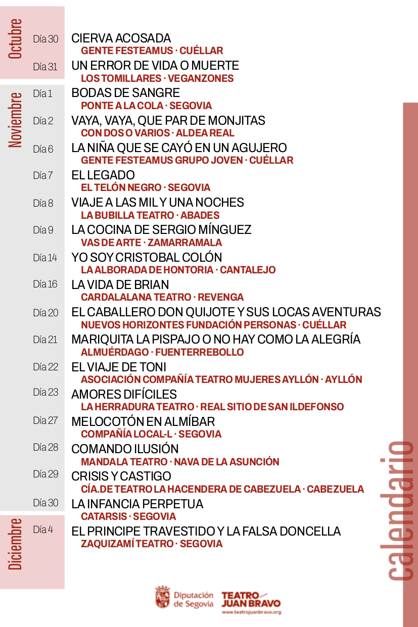Este año, el programa de la Muestra Provincial de Teatro Aficionado promete hacer disfrutar al público con la obra ‘La infancia perpetua’, el 30 de noviembre. Entre las obras destacadas de esta edición también se encuentran ‘La Vida de Brian’, original del grupo de comedia británico Monty Python e interpretada por el grupo Cardalalana Teatro, establecido en Revenga; o la reconocida tragedia ‘Bodas de Sangre’ del poeta y dramaturgo Federico García Lorca, que será llevada a escena por los segovianos Ponte a la Cola. Igualmente, el público podrá disfrutar de la comedia ‘Yo soy Cristóbal Colón’, representada por La Alborada de Hontoria; o de ‘El príncipe travestido y la falsa doncella’ representada por los actores de Zaquizamí Teatro, de Segovia, que será la que cierre esta edición el 4 de diciembre.