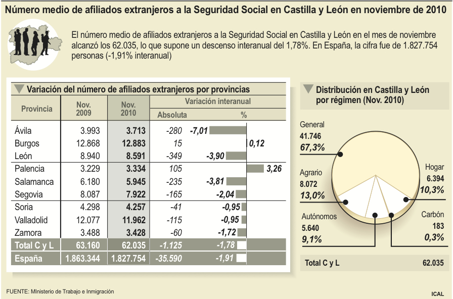 El número medio de afiliados extranjeros a la Seguridad Social en Castilla y León en el mes de noviembre alcanzó los 62.035, lo que supone un descenso interanual del 1,78 por ciento. En el conjunto del país la caída fue mayor, del 1,91 por ciento, hasta la cifra fue de 1,83 millones de personas, según los datos publicados por el Ministeri