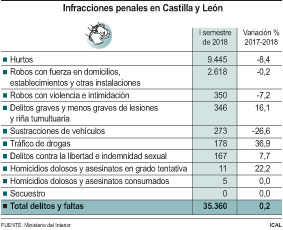 Por el contrario, los robos con violencia e intimidación bajaron un 7,2 por ciento (350), los hurtos un 8,4 por ciento (9.445), las sustracciones de vehículos un 26,6 por ciento (273). En los seis primeros meses también se contabilizaron cinco asesinatos consumados, los mismo que en 2017 y once homicidios dolosos y asesinatos en grado de tentativa, dos más.