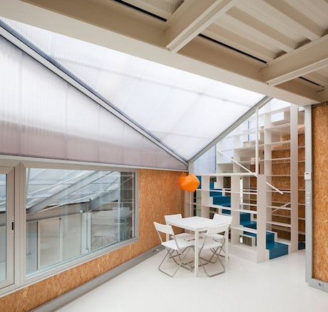 Entre otros materiales, utilizó policarbonato celular que proporciona un aislamiento extra y amplía el perímetro, para envolver un invernadero orientado al sur que recoge calor durante los días de invierno y puede abrirse al exterior durante el verano, con lo que actúa como colchón térmico.