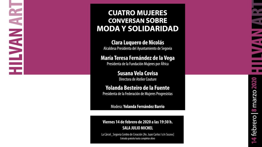 El viernes 14 de febrero habrá una mesa redonda sobre la relación entre moda y solidaridad para reflexionar sobre la moda del ‘de usar y tirar, a costa del trabajo de las mujeres y de la infancia más vulnerable de los países en desarrollo, con la alcaldesa de Segovia, Clara Luquero; la presidenta de la Fundación ‘Mujeres por África’, María Teresa Fernández de la Vega, la directora de ‘Atelier Couture’, Susana Vela Covisa, y la presidenta de Mujeres Progresistas, Yolanda Besteiro. A las 19.30 horas, en la sala ‘Julio Michel’ de La Cárcel-Centro de Creación.