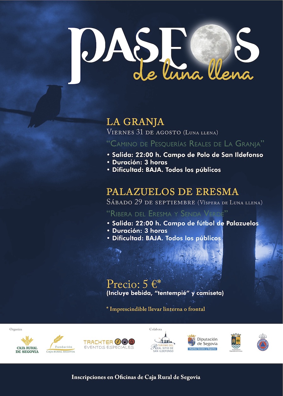 La Fundación Caja Rural de Segovia y la empresa segoviana Trackter Eventos Especiales celebrarán los próximos días 31 de agosto y 29 de septiembre, dos paseos nocturnos por el entorno natural de la provincia de Segovia y “a la luz de la luna llena”. Una actividad, que como señalaron fuentes de la organización “pretende ofertar nuevas alternativas de ocio a los segovianos, fomentar el deporte y el contacto con la naturaleza, y sobre todo, la convivencia de personas de distintas edades”.