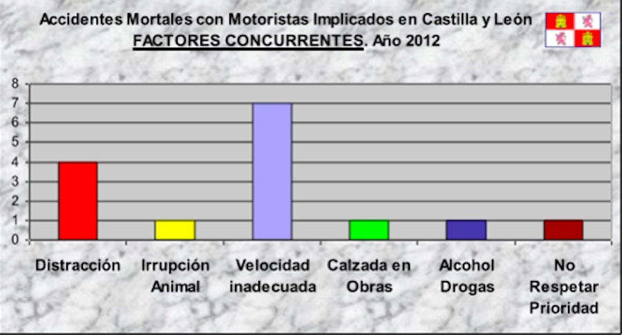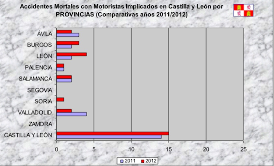Durante el pasado año 2012, se produjeron 15 accidentes mortales con motocicletas implicadas en Castilla y León con 15 fallecidos, (aumento del 7,14% con respecto al mismo periodo del año 2011) en los que resultaron 14 fallecidos. Cabe destacar que de los conductores de motocicletas que se han visto implicados durante el año 2012 en accidentes mortales el 100% hacia uso del sistema de seguridad (casco) mientras que uno de los pasajeros fallecidos no hacía uso del mismo (50%) en el momento del accidente. En el 46,67% de estos conductores la edad es menor a 34 años.