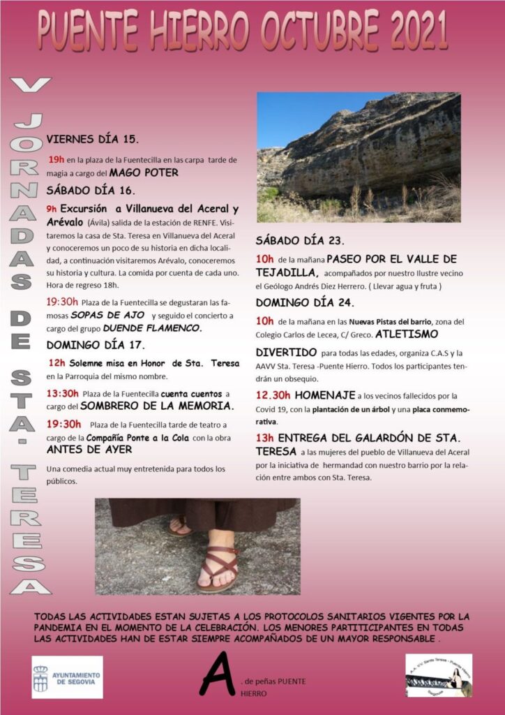 Esta actividad se suma al programa de actos organizado por la Parroquia de Santa Teresa junto con la Asociación de Vecinos Santa Teresa-Puente Hierro, en el que figura, entre otras propuestas, el paseo por el valle de Tejadilla guiado por Andrés Díez el 23 de octubre a las 10:00 horas, y la entrega del galardón Santa Teresa el día 24, desde las 12:30 horas.