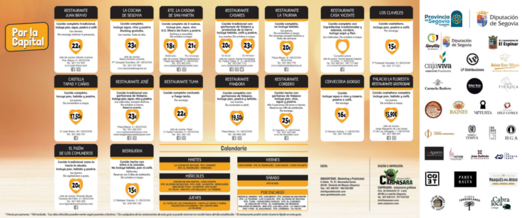 Restaurante El Madrileño (Madrid). Aunque está fuera de la provincia de Segovia, también se incluye en esta guía del cocido. Los martes y viernes de septiembre a junio, cocido tradicional «desde hace más de 60 años» por 28 euros.