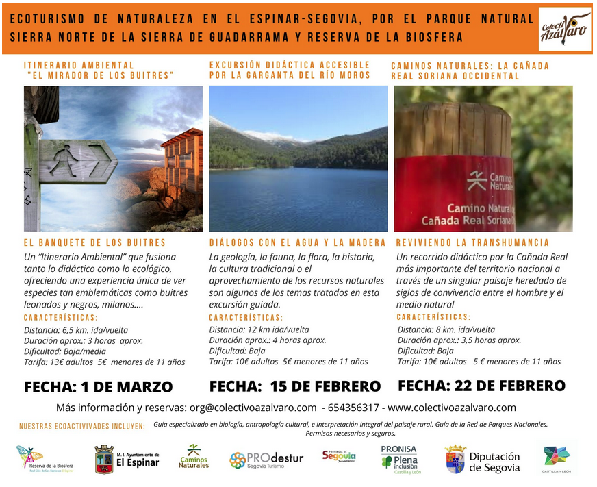 Estos serán los próximos Itinerarios o Excursiones Didácticas Ambientales en el municipio de El Espinar, Reserva de la Biosfera y Parque Nacional Sierra de Guadarrama, con el objetivo de poner en valor su patrimonio cultural o natural, a través del acompañamiento en la observación de la fauna y flora, así como de la interpretación ambiental en el entorno de estos espacios protegidos para vuestra colaboración en su difusión.