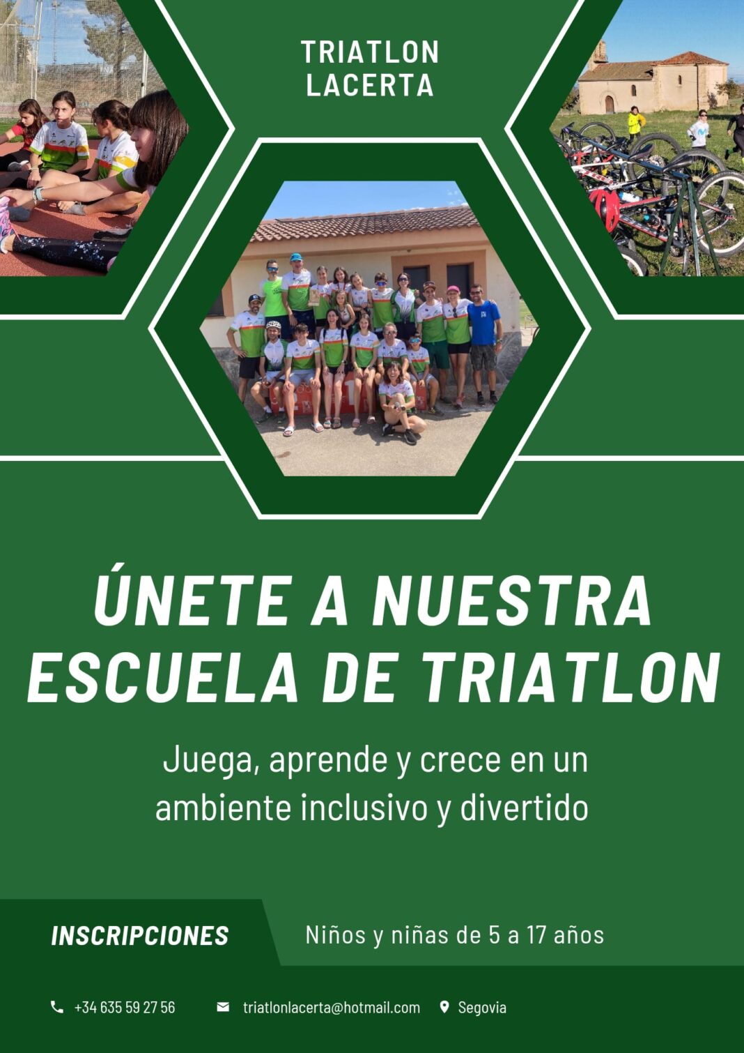 Toda la información de la Escuela con los grupos, días, horarios, y precios de inscripción se pueden encontrar en la página web de CD Triatlón Lacerta. También se puede solicitar información en los teléfonos 635592756 (Juan Pedro) y 633794535 (María).