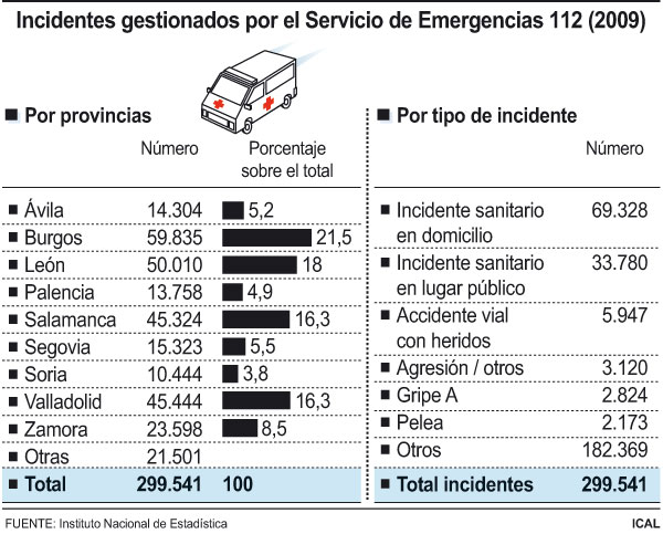 Según el tipo de incidentes, los registrados en el ámbito sanitario dentro del domicilio ascendieron a 69.328, mientras que los acaecidos en lugar público fueron 33.780. El Servicio de Emergencias 112 Castilla y León coordinó la atención de 6.528 accidentes de tráfico con heridos y atrapados, 1.156 atropellos, 958 accidentes laborales, 383 solicitudes de ayuda por vehículos atrapados en la nieve, 1.545 solicitudes de máquinas quitanieves, 8.286 incendios, 180 búsquedas de personas extraviadas, 222 operaciones de rescate (de ellas, 145 en la montaña) y 19 accidentes de avioneta, ultraligero o parapente. Además, el 112 atendió un total de 2.824 incidentes relacionados con la Gripe A, y 21.501 que fueron notificados a través de los servicios de emergencias de autonomías limítrofes.
