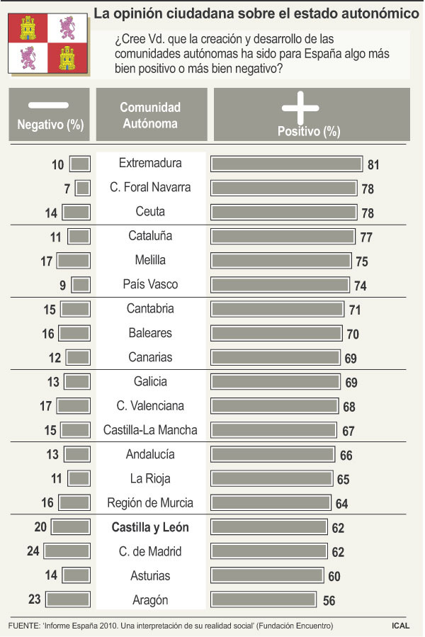 Seis de cada diez ciudadanos de Castilla y León opinan que la creación del modelo autonómico ha sido algo bueno para el desarrollo del conjunto de España y para todas las autonomías. En concreto, el 62 por ciento se posiciona en esta sentido, frente al 14 por ciento que considera que ha sido algo negativo. No obstante, si se compara el dato con el conjunto de autonomías se observa que Castilla y León ocupa el vagón de cola en optimismo, sólo por delante de Madrid (24 por ciento), Aragón (56 por ciento) y Asturias (60 por ciento). Entre las que observan el modelo con mayor aliento se encuentran Extremadura (81 por ciento), Navarra y Ceuta (78 por ciento), y Cataluña (77 por ciento).