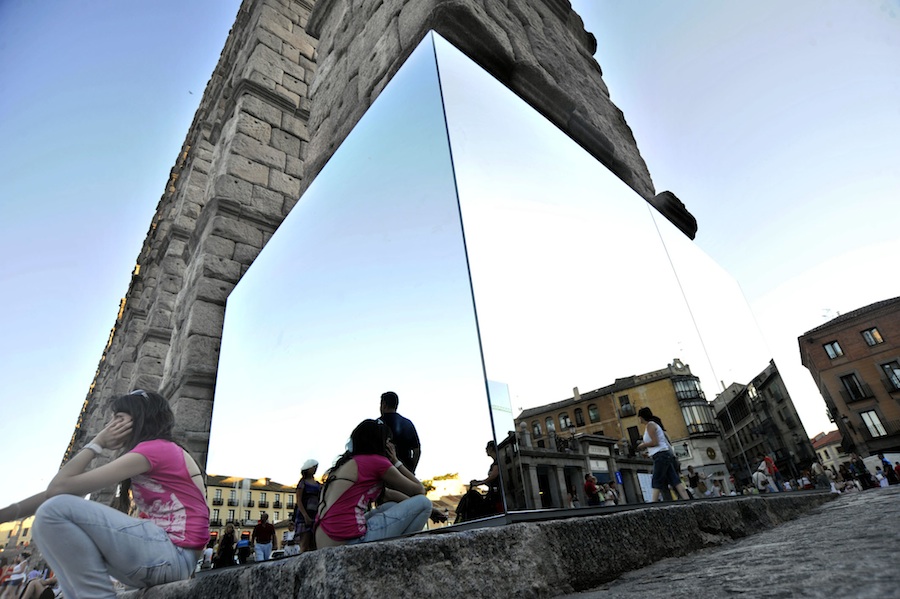 Existe un antecedente, con motivo de la celebración del 125 aniversario de la declaración del Acueducto como monumento nacional. El artista Eugenio Ampudia trató de hacer creer que el gran puente de piedra levitara. Lo consiguió mediante un zócalo prismático de espejo que ocultaba la base de los arcos hasta una altura de dos metros dando la sensación de que el monumento flotaba. La intervención, que llevaba por nombre, Conductis Vocis, incluía una proyección audiovisual sobre el cuerpo del Acueducto.
