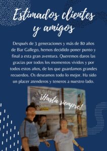 Nunca es fácil despedirse de alguien o algo importante, este 2024 toca hacerlo. El 31 de diciembre el Bar Gallego cerrará sus puertas tras más de ochenta años de actividad. «Ha sido un placer atenderos y teneros a nuestro lado«, aseguran en un sencillo cartel. El placer, sin ninguna duda, ha sido nuestro.