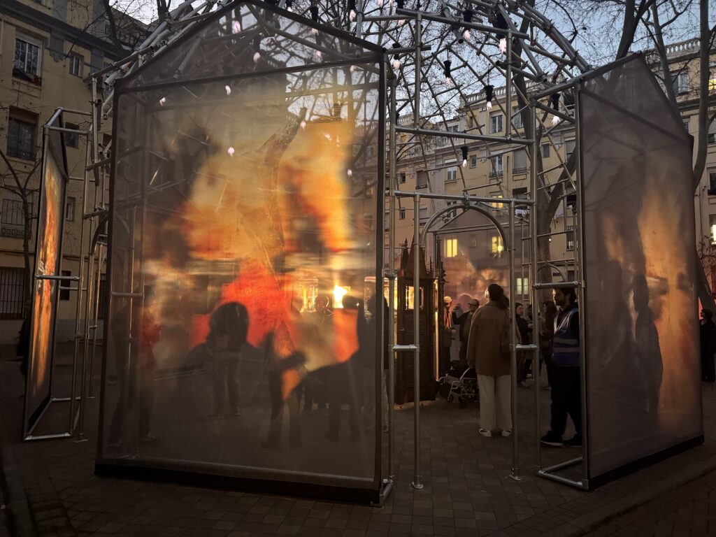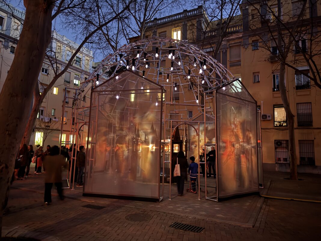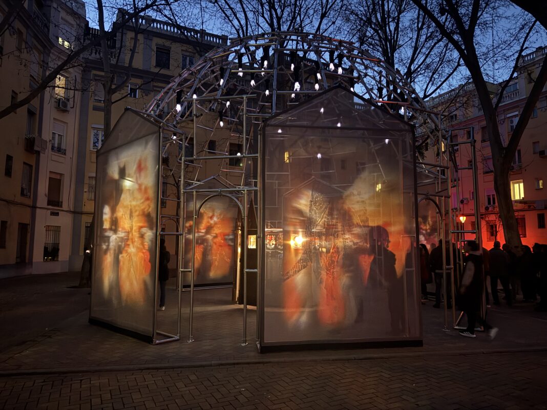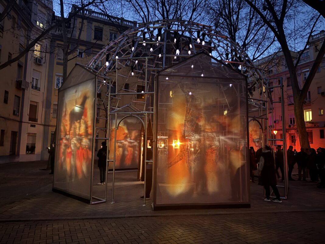 En la Glorieta de San Víctor, en el barrio madrileño del Pico del Pañuelo, ocurre algo extraño cuando cae la noche. Bajo una estructura metálica que recuerda a una cúpula o a un pequeño templo industrial, sombras rojas giran lentamente. Animales y hombres se mueven en círculo, atrapados en una especie de danza hipnótica. El espectador entra, camina bajo esa arquitectura translúcida y, sin darse cuenta, se convierte en parte del ritual.