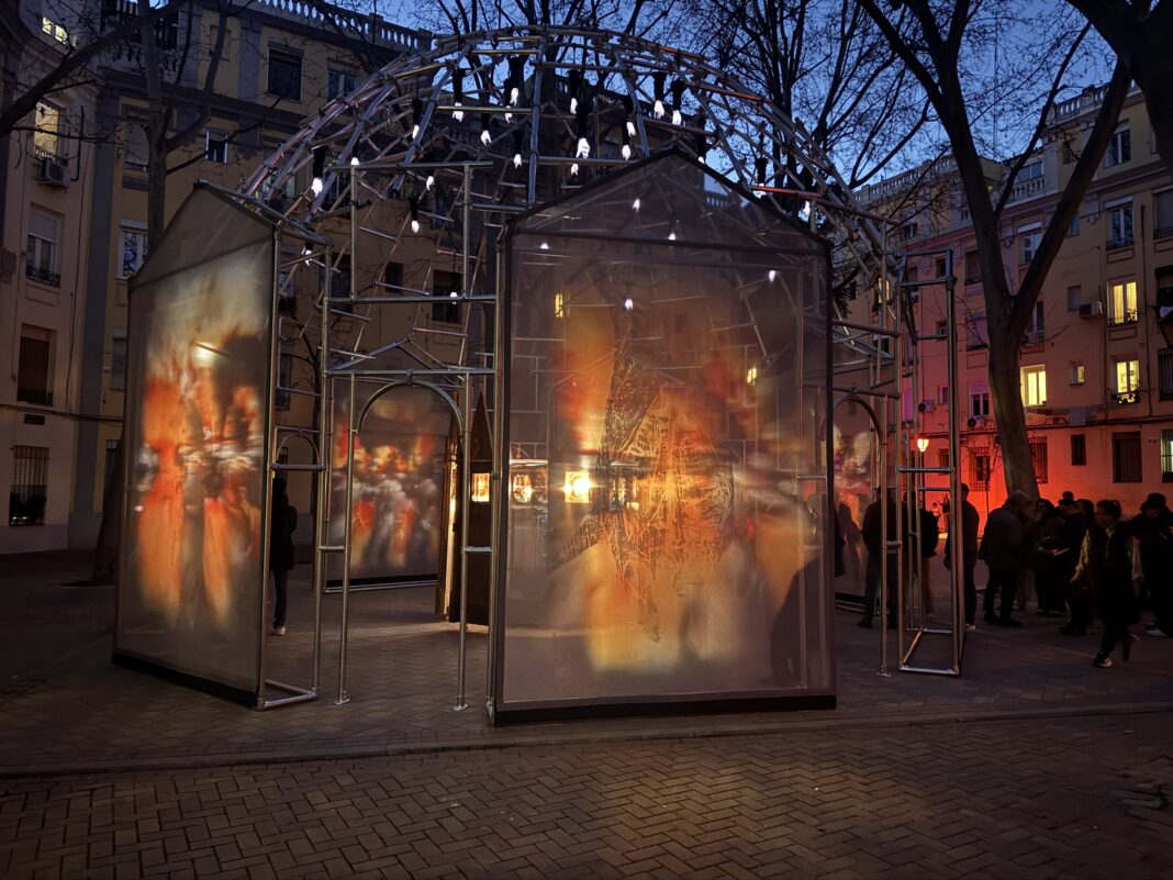 La instalación se llama «Redentora», y es la nueva obra del artista segoviano Gonzalo Borondo, creada específicamente para el festival LuzMadrid 2026. Pero más que una instalación lumínica, es un artefacto de memoria.
