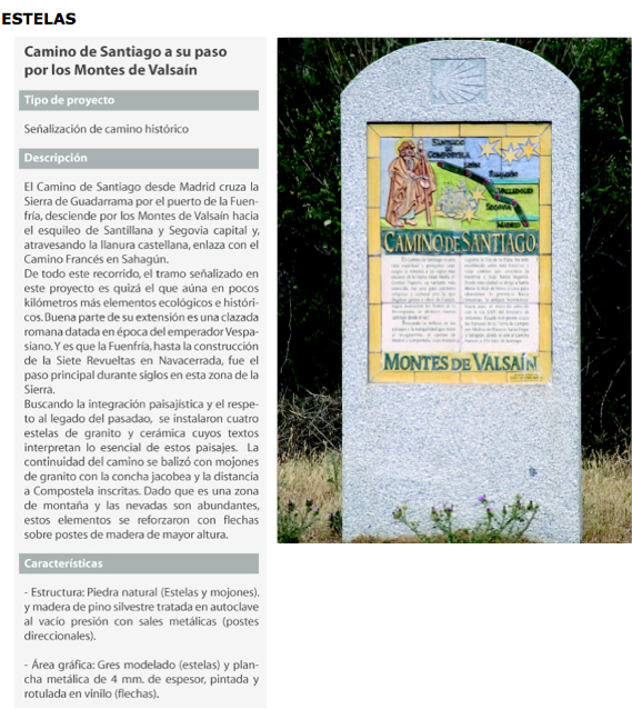 El segundo modelo son las estelas de granito, que en las próximas semanas se procederá a su ubicación en el término municipal de Segovia. En ellas se engarza un mural de gres modelado con textos sobre la ciudad de Segovia y su relación con el ramal del Camino de Santiago que une Madrid con Sahagún.