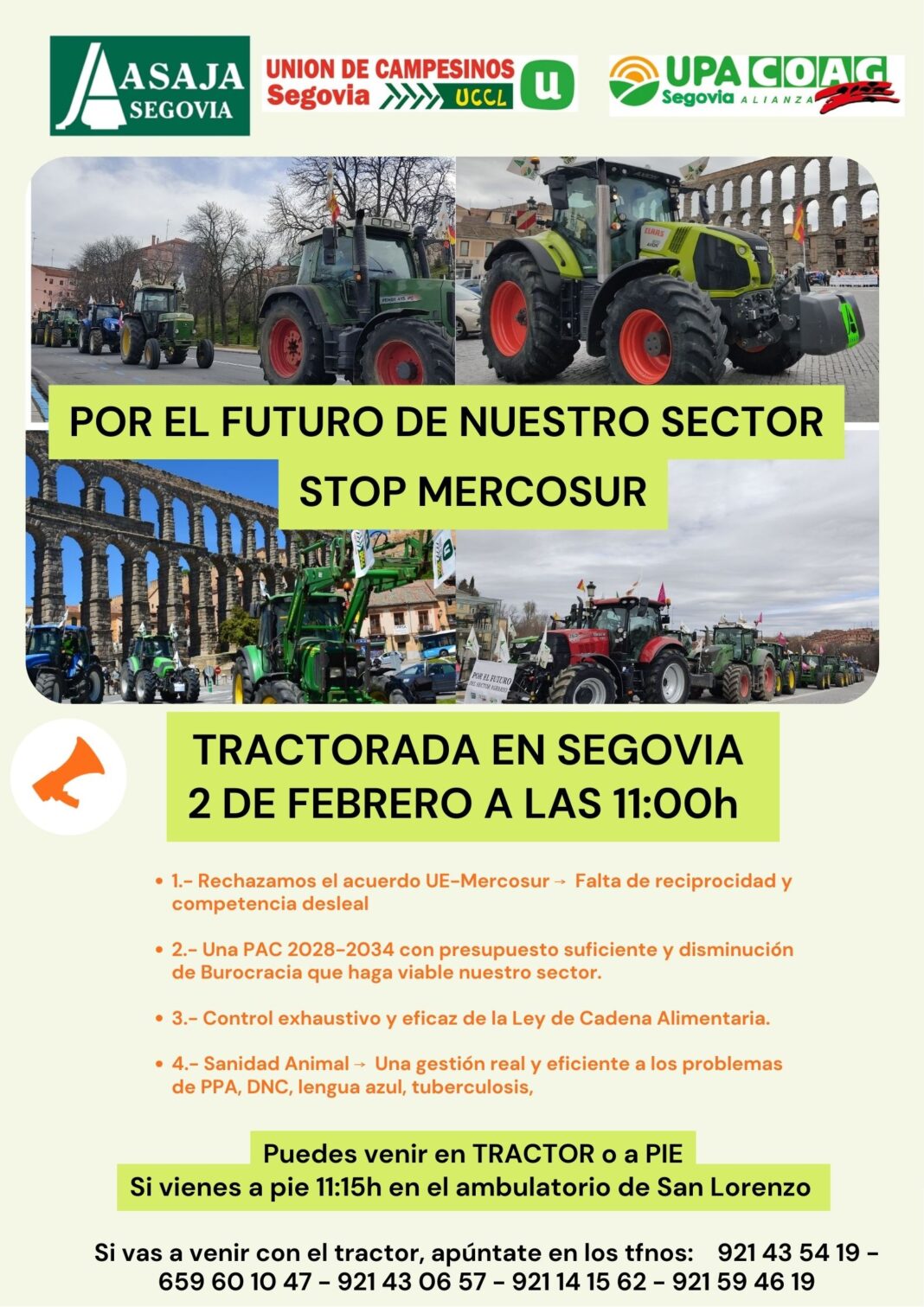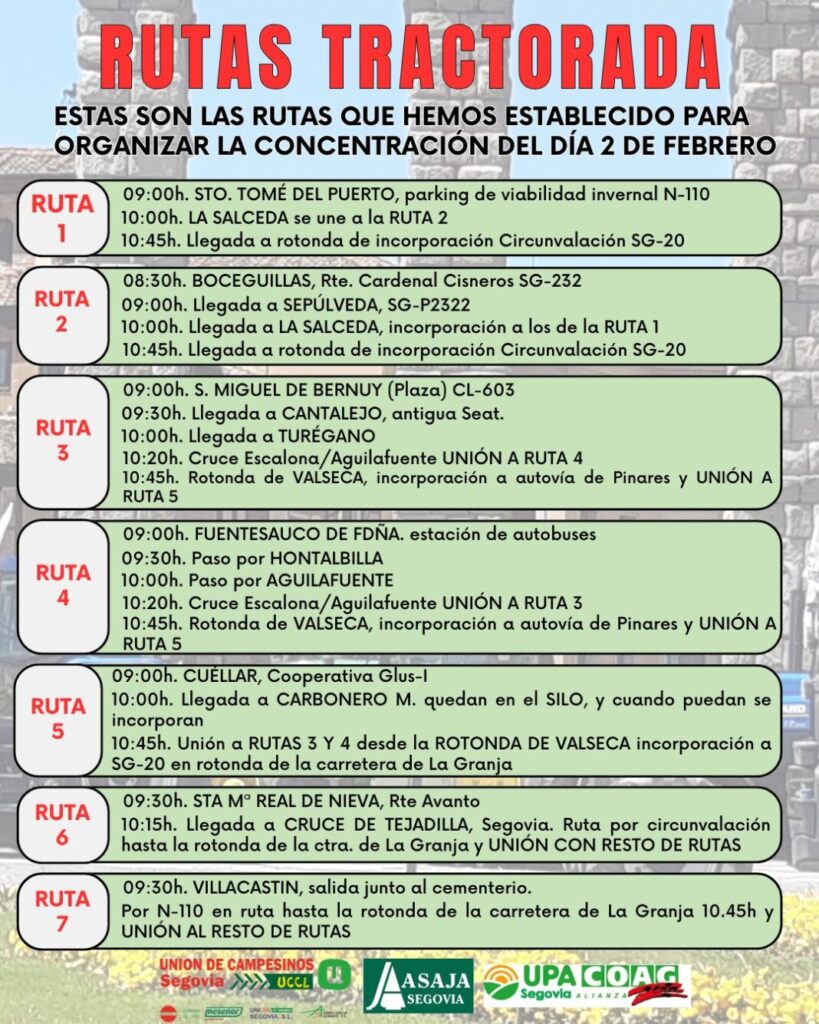 Bajo el lema «Por el futuro de nuestro sector, stop MERCOSUR», la Unión de Campesinos de Segovia, ASAJA Segovia y la Alianza UPAA-COAG se unirán en diversas tractoradas el lunes 2 de febrero, que tendrán lugar tanto en la ciudad como en el entorno rural.