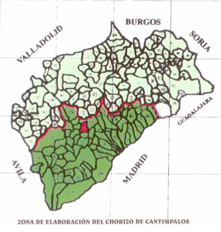 La zona que está delimitada para la elaboración del Chorizo de Cantimpalos es la siguiente, estando señalado en rojo el municipio de Cantimpalos, que da nombre al chorizo. La zona está delimitada por la altitud, los municipios integrados en ella están por encima de los 900 m de altitud y tienen una tradición chacinera perpetuada entre generaciones.