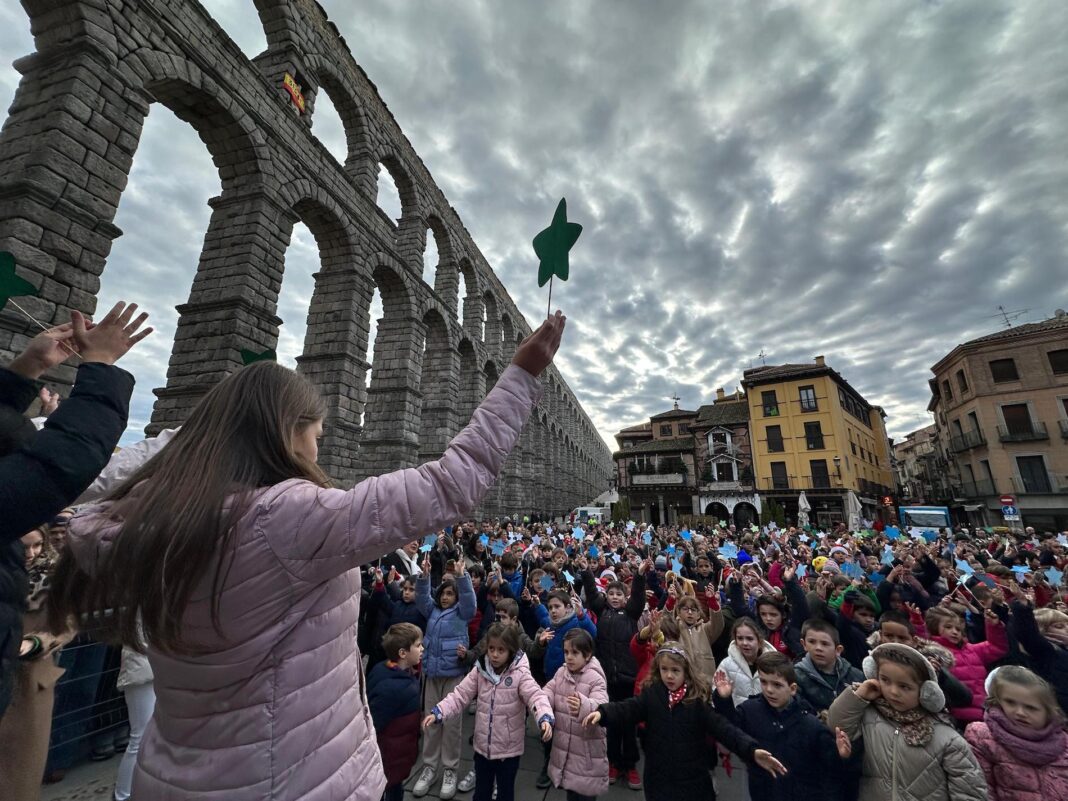 En la plaza del Azoguejo se han reunido alrededor de 800 niños y niñas de educación infantil y primaria de este centro de enseñanza para invitar a los segovianos a «encender la luz de la Navidad», y comenzar una cadena de gestos por los demás.