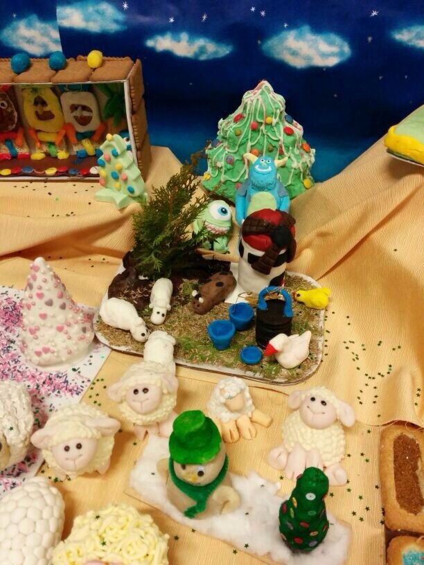 Detalle del belén con las ‘ovejas modorras’, bautizadas así por una de las madres, de fondo.