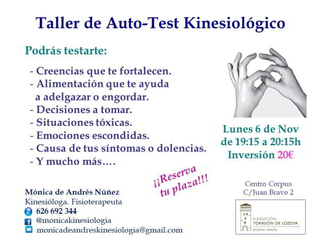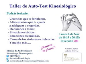 En segundo lugar, el mismo centro, nos ofrece un taller de test auto kinesiológico el lunes 6 de noviembre a las 19:15 de la tarde, con el fin de comprender nuestro cuerpo a la perfección.