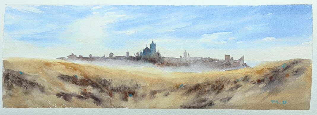 Los perfiles de Segovia – Skyline – son imprescindibles en mis pinturas. Desde 2011 he pintado varias versiones, unas más coloridas y otras combinando los cielos segovianos con un contrastado perfil. En esta ocasión hay un nuevo enfoque con paletas de color cálidas, puesto que eso es lo que me motiva a pintar esta abstracción de Segovia. Me considero una privilegiada porque a pocos metros de donde vivo puedo ver “mutar” la luz que baña a Segovia desde esos amaneceres suaves a esos rosas intensos, como los atardeceres naranjas, rojos…entre nubes o a cielo raso. Un espectáculo para los sentidos.