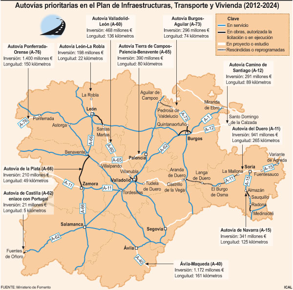 El nuevo Plan también recoge la construcción de la Autovía de Tierra de Campos (A-65) entre Benavente y Palencia, presupuestada en 390 millones para sus 80 kilómetros, así como la A-73 (Burgos-Aguilar de Campoo), que tendrá una longitud de 74 kilómetros, tras invertir 296 millones. Además, el Ministerio incluirá en el PITVI las autovías Ponferrada-Orense (A-76), que tendrá 150 kilómetros y un presupuesto de 1.400 millones; la León-La Robla, paralela a la N-630, cuyos 22 kilómetros supondrán un desembolso de 198 millones; la A-68, entre Alfaro y Miranda de Ebro, y la A-12 del Camino de Santiago entre Burgos y Santo Domingo de la Calzada.