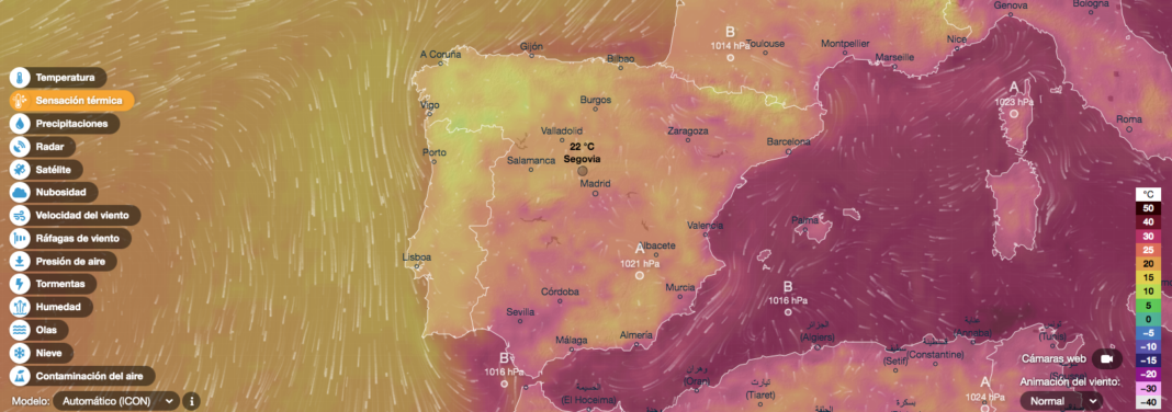 Ventusky ofrece la posibilidad de consultar la temperatura, por un lado, y la sensación térmica, por otro.