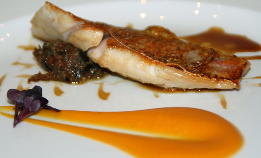 ‘Lomo de salmonete, tomate confitado, puré de calabaza y vainilla’.