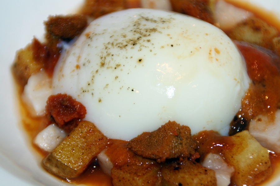 ‘Patata, papada ibérica y huevo campero, langostino y erizo de mar’.
