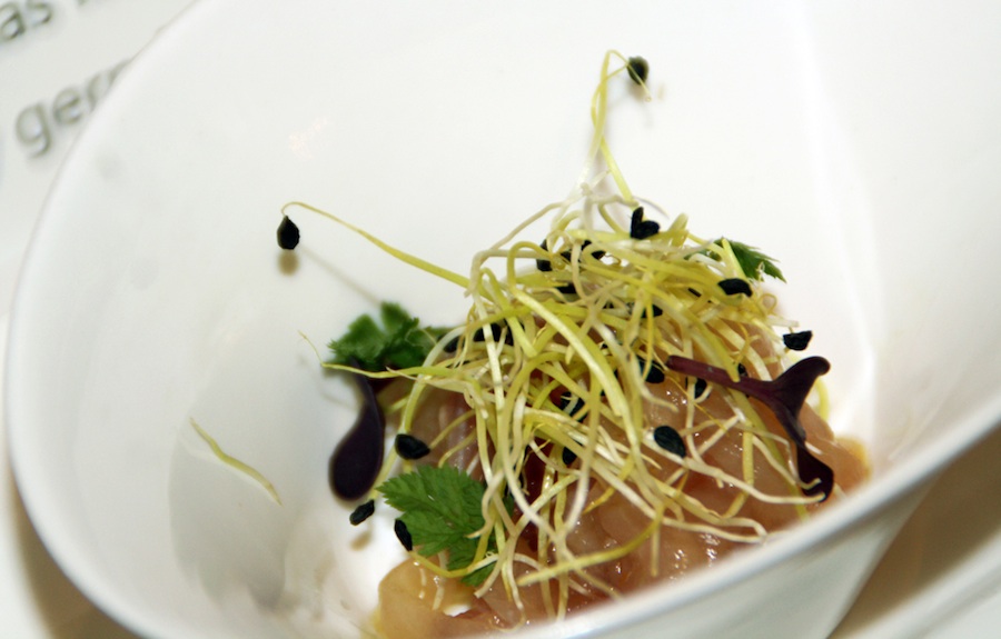 ‘Lubina de nuestras costas marinada, aceite de arbequina y germinados’.