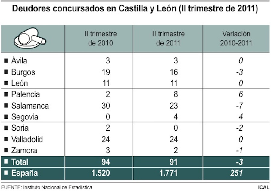 Castilla y León contabilizó 91 deudores concursados en el segundo trimestre de 2011, lo que supone un descenso del 3,19% respecto al mismo período del ejercicio anterior cuando se registraron 94. Un descenso que contrasta con el incremento anotado en el conjunto del país, del 16,5 por ciento, según los últimos datos publicados por el Instituto Nacional de Estadística (INE).