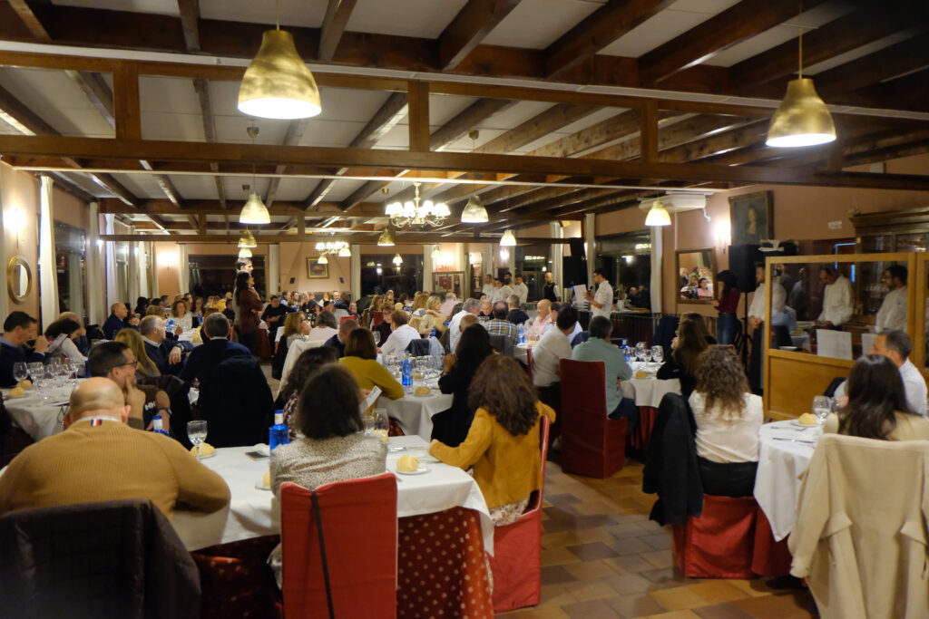 Los asistentes disfrutaron de los vinos ecológicos de la Bodega García Serrano de Nava de la Asunción. Estos sorprendieron con propuestas frescas y originales: desde el Voltio tinto garnacha, acompañado de crema de calabaza; hasta el Matabuey verdejo joven con hojaldre de merluza y gambas. El menú siguió con un Sendero del Pino tempranillo maridado con un strogonoff de solomillo de cochinillo; y culminó con el singular Voltio Orange, servido junto a un croquetón de morcilla y trufa.