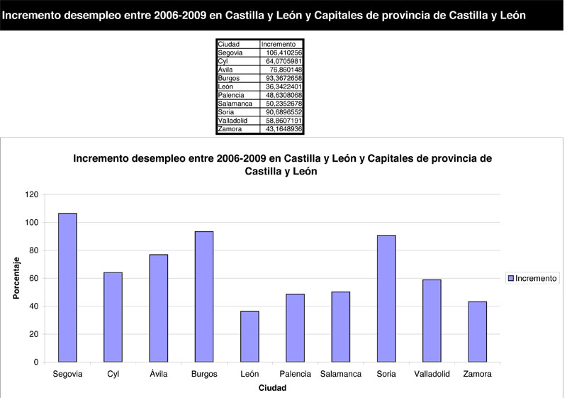 Si comparamos los datos del desempleo en Segovia capital con los del resto de capitales de ciudades de Castilla y León y hacemos una comparativa con el total de la Comunidad Autónoma, “el resultado es preocupante. Mientras que en nuestra ciudad el desempleo creció un 106,4% entre noviembre de 2006 y noviembre de 2009, el resto de las capitales se mantienen alejadas. La más cercana, Burgos, se encuentra a más de 13 puntos, Soria, a16 puntos. En León el crecimiento del desempleo fue del 36,2%, en Palencia del 48,6% y en Salamanca del 50,2%”, añaden.