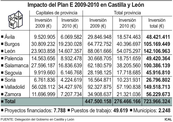 El Plan E se cierra en Castilla y León con una inversión de 723,9 millones de euros en la financiación de 7.788 proyectos desarrollados en los 2.248 municipios de la Comunidad y con una repercusión en el mercado de trabajo de 49.619 empleos, que supera la previsión inicial de los ayuntamientos en un 22,6 por ciento. Los datos de Segovia cifran la inversión en la capital en 9.919.660 euros en 2009, y 6.146.768 euros en 2010. Los datos de la provincia elevan las cifras hasta 28.198.125 en 2009; y 17.718.685 euros en 2010. En resumen, en el conjunto de los dos fondos, Segovia contó con un total de 45.916.810 euros.
