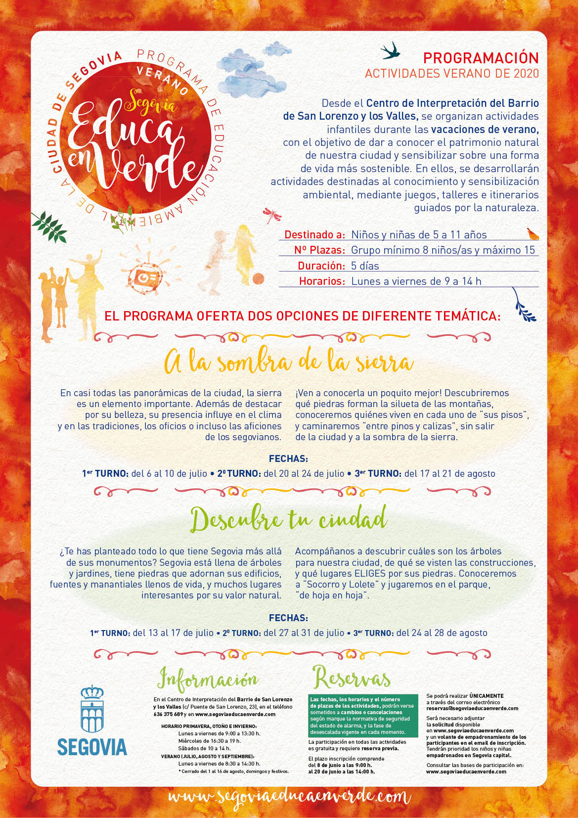 La participación en todas las actividades es gratuita y requiere reserva previa a través del correo electrónico reservas@segoviaeducaenverde.com. El plazo de inscripción se extenderá hasta el 20 de junio a las 14:00 horas. Será necesario adjuntar la solicitud disponible en la web www.segoviaeducaenverde.com, además de un volante de empadronamiento de los participantes que habrá que añadir en el mismo el email de inscripción. Tendrán prioridad los menores empadronados en Segovia capital.