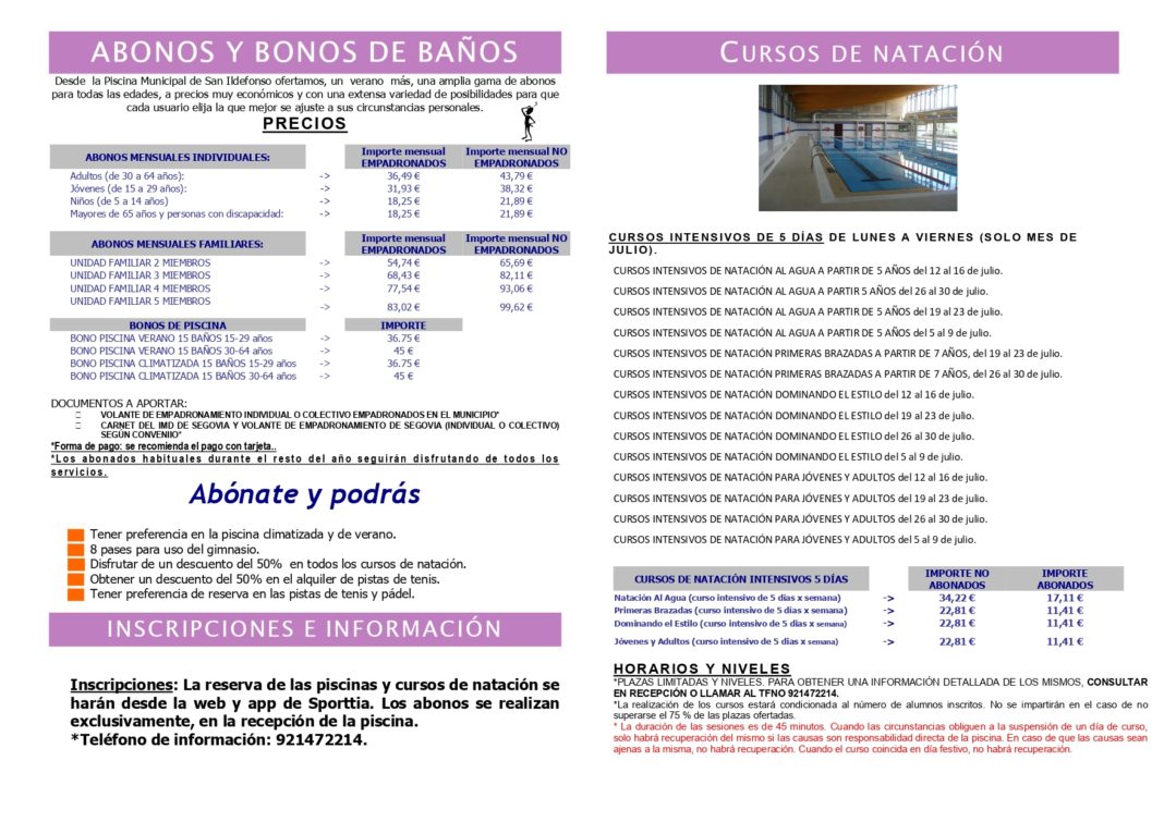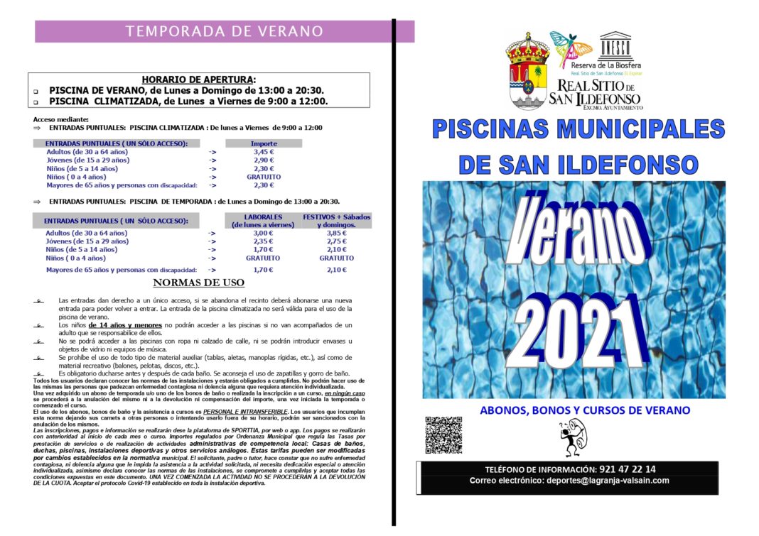En su decimotercera temporada, las Piscinas Municipales de San Ildefonso, ubicadas en la carretera de Torrecaballeros s/n, ofrecen a todos sus usuarios la posibilidad, del disfrute de la piscina al aire libre con una pradera de hierba natural de 6.000m², y que cuenta con un vaso de dimensiones 12,5 x 6,5m. y profundidad entre 0,0 y 0,65m. de tipo chapoteo-infantil, un vaso de dimensiones 33×17,5 m. y profundidad entre 1,20 y 1,80m. de tipo recreo-polivalente y también la opción de utilizar la piscina climatizada con unas dimensiones 25×12,5m. y profundidad entre 1,40 y 1,80m. de tipo recreo-polivalente, climatizado, e instalado en recinto cerrado, cubierto y climatizado.