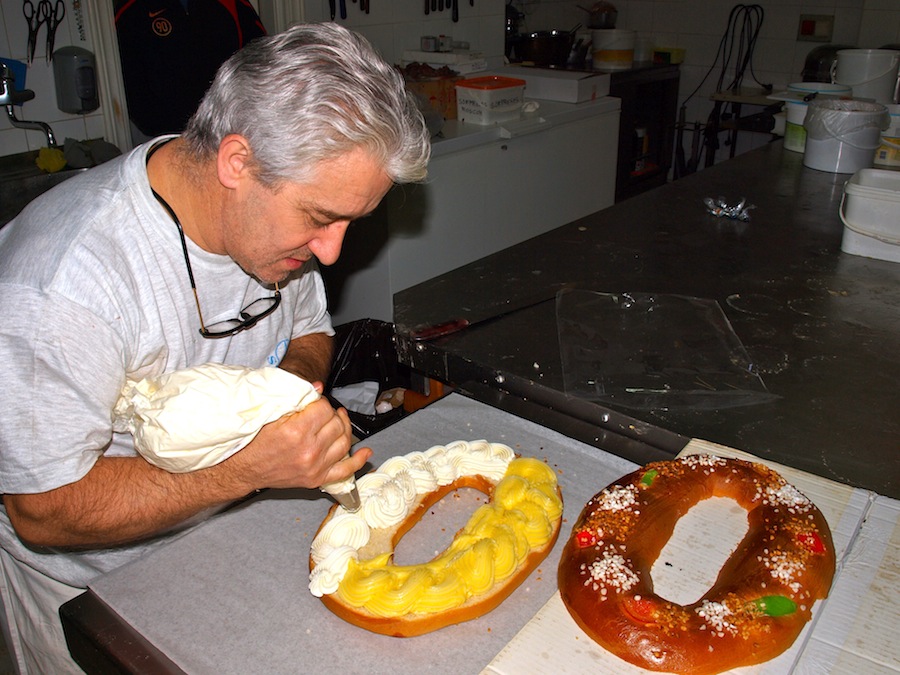 Trabajo a contrarreloj con el objetivo de tener todo listo para una tradición que se remonta a la época romana cuando se cocinaban tortas de higos, dátiles y miel, dedicadas al dios Saturno para festejar los días más largos tras el solsticios de invierno. Otras tradiciones hablan del regalo que se hacían entre reyes de diferentes países para felicitar el comienzo de año. Los roscones, decorados con flores, se repartían por todo el continente para convertirse en la primera comida tradicional del año.
