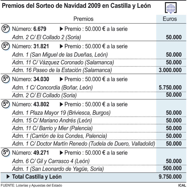En esta ocasión, por provincias, León fue agraciada con cuatro premios por importe de 5,8 millones de euros; en Salamanca cayeron dos premios con algo más de tres millones de euros; Soria se hizo con 600.000 euros procedentes de tres premios; Palencia con 100.000 de dos; y Valladolid y Burgos repartieron 50.000 euros cada una de sendos premios.