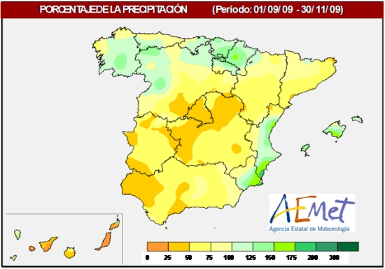 En cuanto a la distribución geográfica de las precipitaciones (figura 2), cabe resaltar que éstas sólo han alcanzando o superado los valores normales en el área levantina, Galicia y áreas contiguas del noroeste de Castilla y León y suroeste de Asturias, así como en Cantabria, País Vasco, la Rioja, Navarra y Baleares; en todas estas zonas el otoño ha tenido carácter húmedo siendo incluso muy húmedo en Baleares, área levantina, sureste de Galicia y País Vasco. En el resto de España el otoño ha resultado en general seco a muy seco, quedando las precipitaciones por debajo de sus valores medios, de modo que en Madrid, norte y oeste de Castilla- La Mancha, oeste de Andalucía, la mayor parte de Canarias y áreas de Extremadura y sur de Castilla y León, las precipitaciones no han alcanzado ni siquiera el 50 % de dicho valor medio; este importante déficit pluviométrico se añade al que en estas zonas se había ido generando a lo largo de la primavera y el verano de 2009.