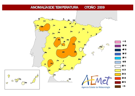 Por lo que respecta a la distribución geográfica de las anomalías de temperatura, en la mayor parte de España éstas han oscilado entre 1ºC y 2ºC, llegando a superar los 2ºC en el suroeste de Galicia, amplias áreas de Castilla la Mancha, sur de Castilla y León y área del bajo Guadalquivir. En Sevilla, Córdoba y Málaga ha sido el otoño más cálido desde 1970, siendo numerosos los observatorios de las regiones del cuadrante nordeste y del extremo suroeste peninsular en las que ha sido el segundo más cálido, sólo superado por el del año 2006. Cabe añadir que, al igual que en la mayoría de las regiones peninsulares, en el archipiélago canario el trimestre fue muy cálido, mientras que en el balear resultó también cálido, aunque con una anomalía térmica inferior a 1ºC.