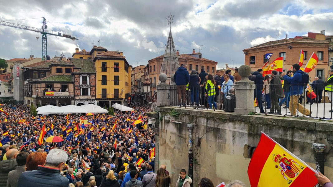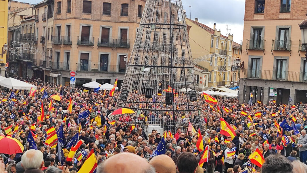 A partir de las 11,30h, las banderas de España comenzaban a llegar a la Plaza del Azoguejo. A las 12,00 era la cita, convocada por el Partido Popular. En ese momento, cerca de 9000 personas, según los datos ofrecidos por Policía Local, y 4.000 conforme a la información de la Delegación del Gobierno, se han manifestado en contra la futura ley de Anministía, y el pacto entre PSOE y Junts, anunciado esta semana y que renovará cuatro años más a Pedro Sánchez, como presidente de Gobierno. La propuesta convocada por el PP ha sido también secundada por empresarios y por VOX, aparte de por otros colectivos que han arropado el acto, simultáneo en otras capitales de España.